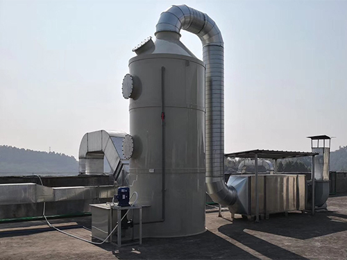 废气通过后面引风机的动力进入喷淋塔,在喷淋塔的上端喷头喷出水雾状吸收液均匀分布在填料上,废气与吸收液在填料表面上充分接触,由于填料的机械强度大、耐腐蚀、空隙率高和比表面积大的特点,废气与吸收液在填料表面有较多的接触面积和接触时间,从而过滤废气中固体及胶状物质,同时可冷却废气。预处理后的废气会饱含水份,经过塔顶的除雾装置去除水份后进行后续处理。吸收液可循环使用,需定期清理水槽中杂质即可