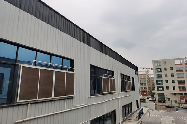 在车另一侧窗户上安装成城汇彩网#7090不锈钢包边铝合金水帘墙(约300㎡),将车间的大门用胶帘进行密闭,让室外的空气从水帘墙穿过,通过水帘降温后,流通到室内,向室内补充鲜冷空气。